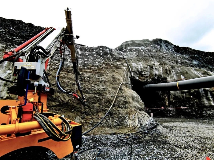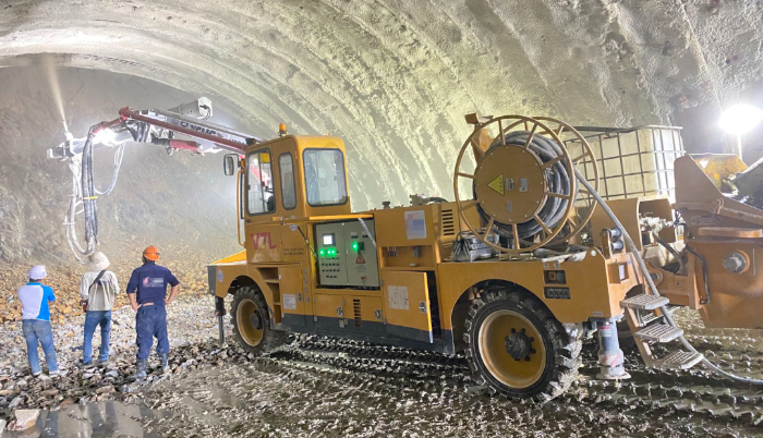 越南某隧道施工现场,三台徐工混凝土喷浆车正在进行一场“双向奔赴”式施工。