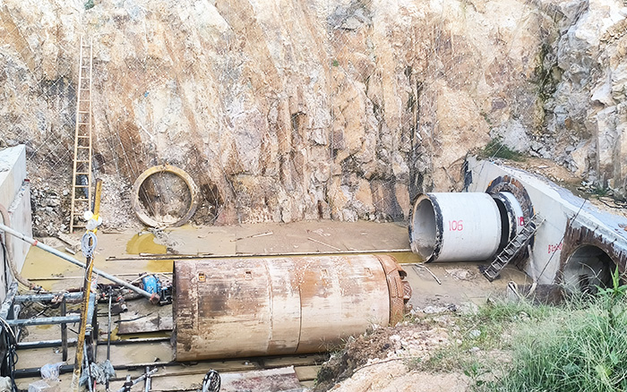徐工XDN1800-R 岩石顶管机横穿202省道、打进山体,顶进地层全段为硬岩(花岗岩)以及少数的弱风化岩石地层,岩石硬度在120~140MPa 左右,单段顶进 210 米,顶进直径1.8米、长2米的水泥管,最终用时58天,顺利出洞。