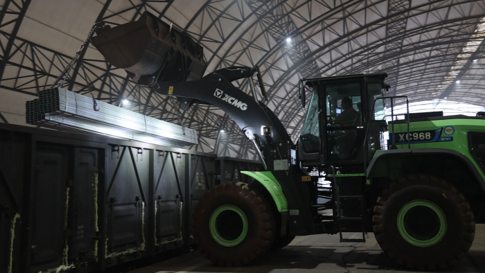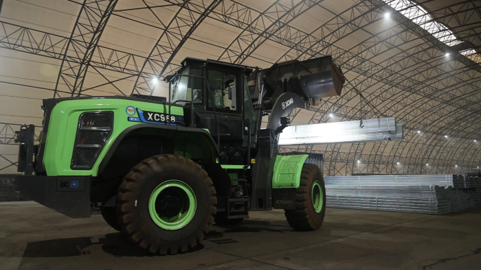 货运站台上,一台绿甲战士格外引人注目,这台徐工XC968-EV纯电动装载机不同以往的圆弧型大臂像极了武侠小说中的“圆月弯刀”,格外引人注目。