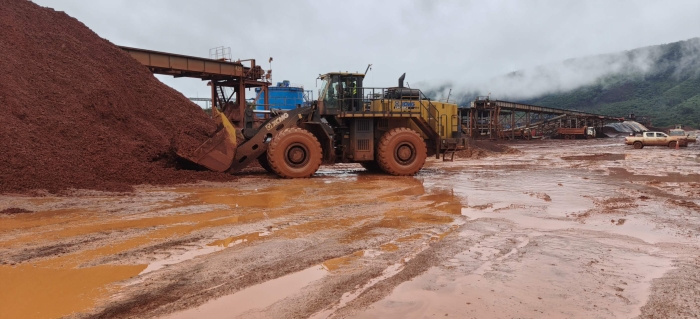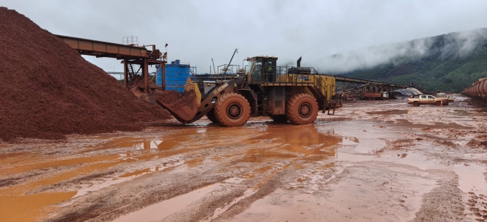 非洲某矿区,徐工LW1200KN轮式装载机正对开采出的矿粉进行堆垛作业,恰逢雨季,物料饱含水分,LW1200KN的超强重载性能得到充分展现。