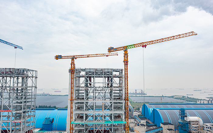 侧望长江畔,机器轰鸣、江水潺潺,华能太仓电厂机组扩建项目施工现场一派繁忙景象,XGT3100-160S、XGT1350-64S两台徐工超大塔稳稳矗立在高耸的钢架间吊装作业。