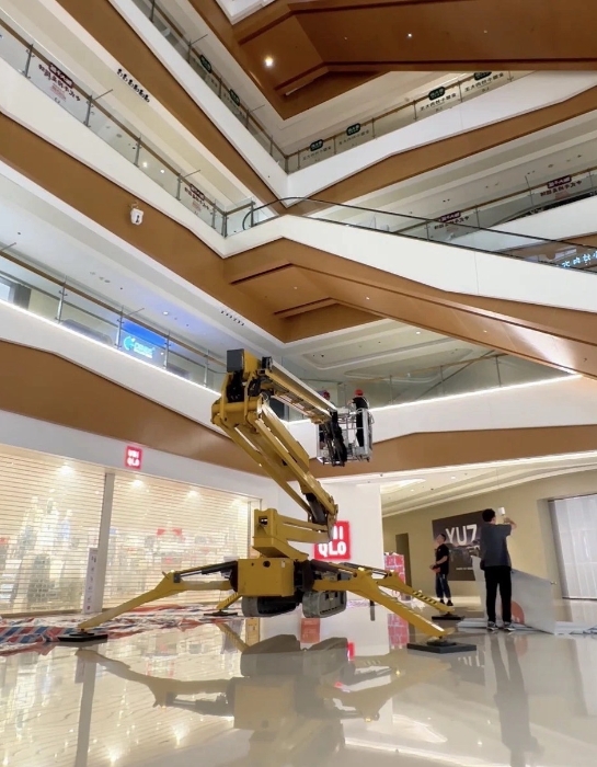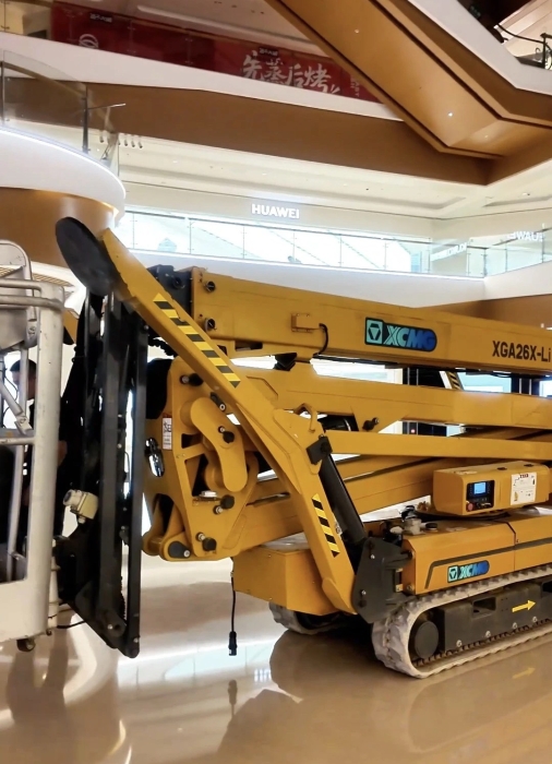 在杭州某大型商场,徐工XGS26X-Li将四只“蜘蛛腿”稳稳“扎根”在商场中庭,正在向玻璃围栏下方的墙壁伸展臂架。超窄车身“溜”进商场、伸缩臂架“瞄”准墙面,这是徐工蜘蛛车在商场进行维修保养的日常。而看似日常的施工,需要面对三关“难题”。